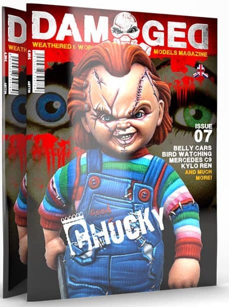 For the seventh issue of Damaged magazine our editor George Mefsut prepared seven articles, which are again devoted to subjects that are less commonly seen in other publications. This includes a post apocalyptic vignette featuring a robot, a racing car converted into a hover car, a space shuttle from the Star Wars universum, a WWII aircraft drop tank converted into a vehicle, an atmospheric ‘bird-watching trip’ diorama, a scratch-built propeller-driven land vehicle, and the famous Chucky doll figure.