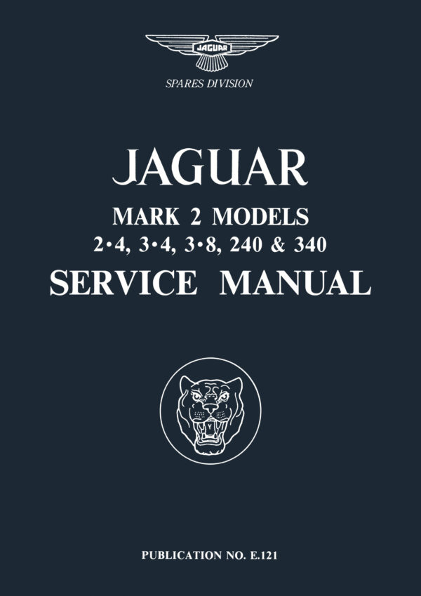 This comprehensive service manual is the original factory publication covering the Jaguar Mark 2 Models, 2.4, 3.4, 3.8, 240 & 340 models with supplementary information. Does not contain the Borg Warner Automatic type 35EG and type 35FG supplements. Covering engines, carburetters, fuel, cooling, propeller shafts, axle, suspension, brake, body work and electrical systems and more. Ideal for both mechanics and those owners who do their own maintenance and repairs. Part number E121/7.
